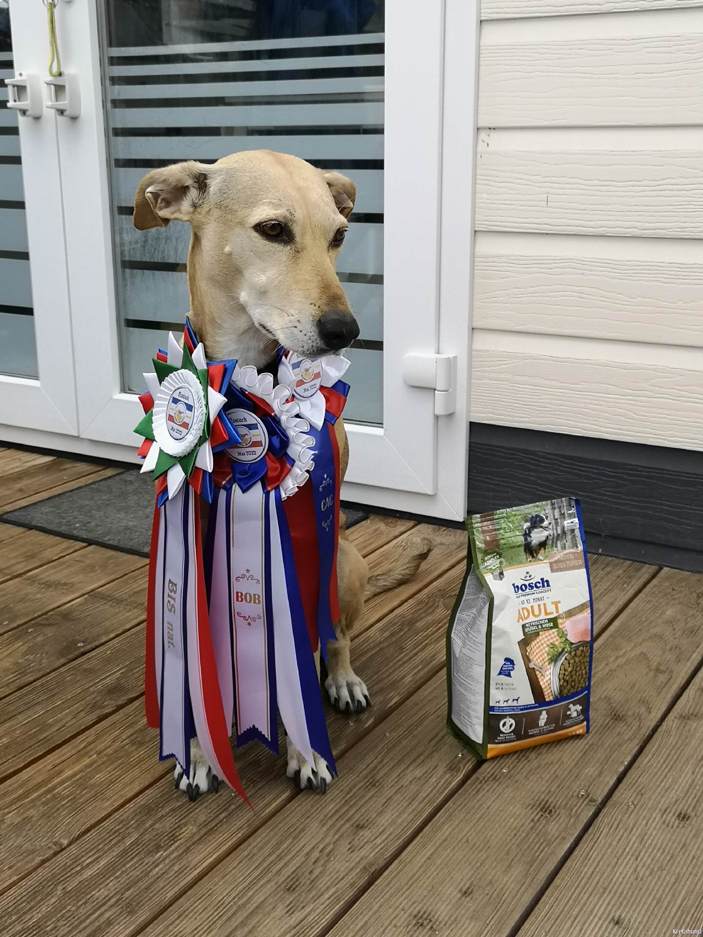 Fouria, die gerade ihre Welpen aufgezogen hatte, bekam in der offenen Klasse das V1, CAC, beste Hündin, Best of Breed und bester Hund der national anerkannten Rassen.