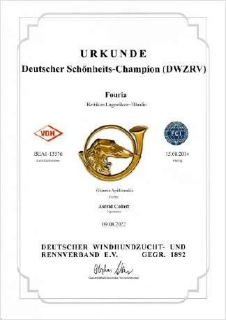 Fouria erhielt in der offenen Klasse das V1, CAC, BOB und den Titel "Landessieger Nord und Mecklenburg-Vorpommern". Synnefia erlief sich in der Veteranenklasse das V1, das Veteranen-CAC und den Titel "Veteranen-Landessieger Nord und Mecklenburg-Vorpommern".