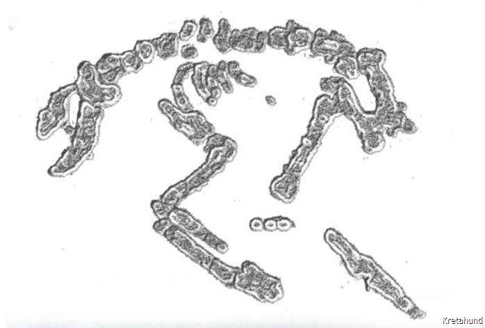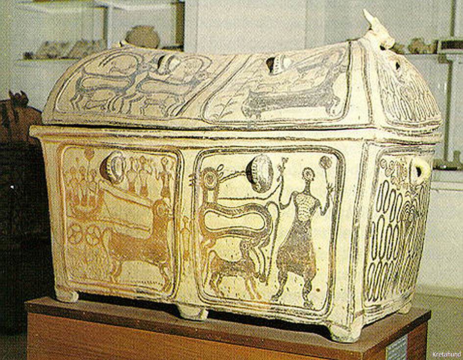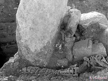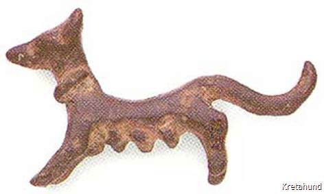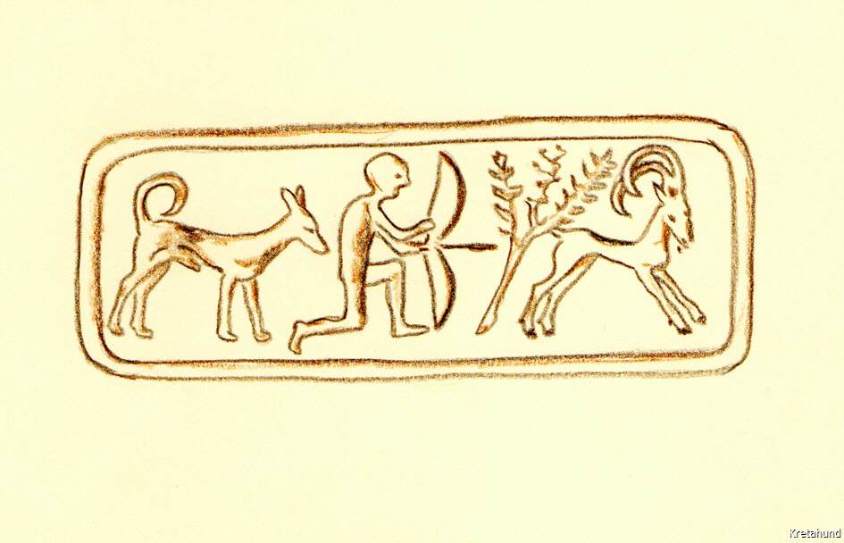 Dieser Eindruck wird bestätigt durch die Ausgrabungen der British School of Archaology in Roussolakos bei Palaikastro im Osten Kretas. Hier befand sich in minoischer Zeit die größte Siedlung Kretas, Eliá, mit einem bedeutenden Heiligtum des Diktäischen Zeus. Ein in diesem Heiligtum entdeckter Siegelabdruck zeigt einen Jäger mit zwei Hunden, die eine Kretische Wildziege angreifen. In unmittelbarer Nähe fand man zwei Brunnen aus spätminoischer Zeit (ca. 1450 v. Chr.) und darin die Skelette von verschiedenen Säugetieren, Pferden, Schafen, Ziegen, Schweinen usw., 55% dieser Knochen stammten jedoch von Hunden, unter ihnen waren 28 vollständig erhaltene Hundeskelette. Die Hunde waren verschiedenen Alters, vom jungen Welpen bis zum sehr alten Hund, dessen Zähne bis auf die Knochen abgenutzt waren. Wie uns der leitende Archäologe der Ausgrabung, Alexander MacGillivray, erklärte, wurden diese Hunde nach ihrem Tod der Gottheit als Opfer dargebracht. Sie wurden mit Grabbeigaben bestattet, und die Art der Bestattung weist auf den hohen Status des Hundes im minoischen Kreta hin. Der Hund war ein heiliges Tier, denn er war wichtig für die Jagd, die nicht nur der Nahrungsbeschaffung diente, sondern auch eine rituelle Handlung darstellte. Die Jagdbeute, meistens Hase oder Wildziege, wurde als Opfertier verwendet.
