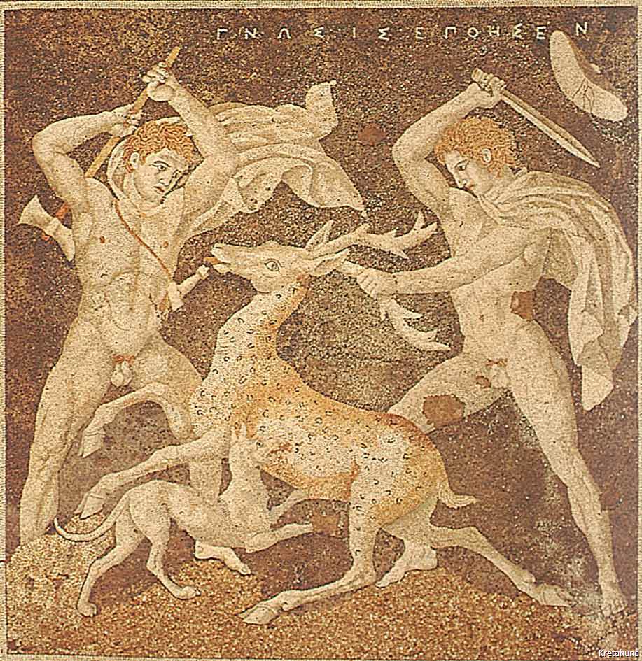 Die Römer haben auf Kreta in der Zeit von 67 v.Chr. bis 330 n.Chr. mehrere Mosaiken mit Hundebildern hinterlassen, von denen sich u.a. im Museum von Kastelli-Kissamos einige sehr gut erhaltene befinden.