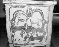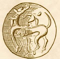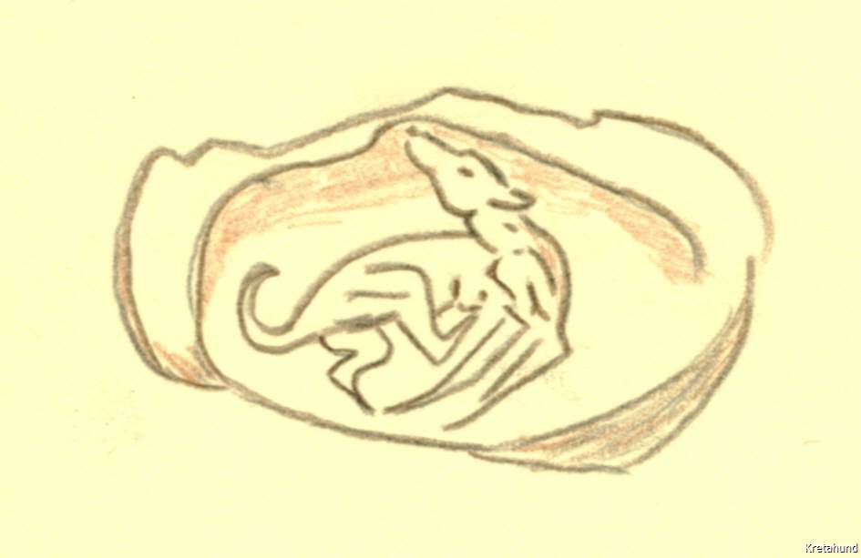 Handelt es sich um die Rassenklassifikation, so kann es gar keinem Zweifel unterliegen, dass wir es mit einem echten Windhund zu tun haben, der einen primitiven Charakter bewahrt hat. Ebenso sicher ist es, dass er mit dem früher von mir beschriebenen Ibizahund der Balearen-Inseln nahe verwandt, ja geradezu identisch ist. Schlechter gehaltene Balearenhunde lassen sich hinsichtlich der äußeren Erscheinung und dem Benehmen kaum vom Kreterhund unterscheiden. Beide haben ihr Stammland im Niltal. Es sind lebende Reste der alten Pharaonen-Windhunde, die sich kaum verändert haben. Während wir bisher nur die Relikten-Kolonie auf den Balearen kannten, kommt jetzt eine zweite in Kreta hinzu. Verfolgen wir die Geschichte der Rasse nach rückwärts, so erkennen wir, dass ihre Blütezeit in die zweite Hälfte des ersten vorchristlichen Jahrtausends fällt. Die Kreterhunde waren im Altertum berühmt und kamen vielfach nach Griechenland hinüber. Wir besitzen vorzügliche bildliche Darstellungen derselben. Sie finden sich auf altkretischen Münzen, insbesondere auf Münzen des antiken Kydonia. Der Sage zufolge soll sogar der Gründer dieser Stadt in seiner Kindheit von einer Kreterhündin gesäugt worden sein. Wie mir der berühmte Numismatiker Imhoof-Blumerbrieflich mitteilt, reichen diese altkretischen Münzen hinsichtlich ihres Alters nicht über das Jahr 500 v. Chr. hinauf. Eine reiche Auswahl derartiger Münzen mit schönen Windhundbildern, die alle Stehohren erkennen lassen, enthält das numismatische Werk des griechischen Archäologen J- N. Svoronos. Gute Hundebilder aus Altkreta gibt auch Otto Keller in seinem Werke über „Die antike Tierwelt“ nach Vorlagen, die ihm Imhoof-Blumer geliefert hat. Die einstigen Lieblinge der Artemis sind indessen schon vor dem Erscheinen der Hellenen in Kreta eingewandert. Ich fand im Museum in Kandia ein Windhundbild aus der ältesten minoischen Zeit, die weit hinter die mykenische Periode zurückgeht. Es stammt aus Mochlos (Mirabellabai) und wurde von dem Amerikaner R. B. Seager ausgegraben. Es ist ein stehohriger Windhund in liegender Stellungauf dem Deckel eines aus schwarzem Steatit gearbeiteten Gefäßes. Ich gebe nebenstehend das Bild in natürlicher Größe nach einerZeichnung, die ich in Kreta angefertigt habe (Anm.: Eine fast identische Pyxis wurde in Zakros gefunden). Wir müssen somit annehmen, dass schon zur Zeit der ältesten Dynastien in Ägypten große Windhunde nach Kreta gelangten und also mindestens seit 4000 Jahren dort vorhanden sind. Eine weitere Rasse, mit voriger nahe verwandt und offenbar aus der gleichen Region eingewandert, tritt uns in den stark verbreiteten Jagdhunden entgegen. Man verwendet sie hauptsächlich zur Jagd auf Hasen, Steinhühner und Wildtauben. Ihre Behaarung ist bald kurz und dicht anliegend wie bei den Laufhunden, bald länger nach Art eines Setter. Der Kopf, im Schnauzenteil vorgezogen, trägt mäßig umfangreiche Hängeohren. Die Körperfärbung ist sehr verschieden. Als häufigstes Vorkommen habe ich notiert: dunkel-braun mit rostfarbener Schnauze und rostfarbenen Pfoten, weiß mit rostbraunen Flecken, schwarz mit heller Schnauze, weißen Läufen und weißer Schwanzspitze, endlich weiß mit schwarzen Scheckenflecken. Manche Individuen sind in den Beinen ziemlich tief gestellt, bei anderen fiel mir auf, dass sie sehr hochbeinig sind und dann stark an die altägyptischen Jagdwindhunde erinnern. Ich glaube nicht, dass dies von einerEinkreuzung mit Kreterhunden herrührt, sondern dass wir Vererbung von altägyptischem Blut anzunehmen haben, also ebenfalls eine Reliktenform vor uns sehen. Solche hochbeinigen, hängeohrigen Jagdhunde sind wohl frühzeitig aus dem Niltal eingewandert, denn auf einer altkretischen Münze aus Südkreta, die in Phaistos gefunden wurde, ist dieser Hund recht gut abgebildet. Wahrscheinlich hat er sich von Kreta aus nach Sizilien verbreitet, mit dem schon zur Zeit des Minos Beziehungen bestanden haben. Otto Keller macht die ganz zutreffende Bemerkung, dass die sizilianischen Griechen eine große Vorliebe für Jagd-Windhunde besaßen. Antike Münzen aus Segesta und Syracus enthalten recht gute Darstellungen solcher Hunde, die mit den Kretern, wie der genannte Autor sagt, eine Verwandtschaft besitzen. Die heutigen russischen Windhunde oder Barsoi stammen wohl ebenfalls von Kreterhunden ab.”