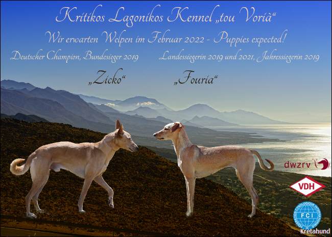 Aber nun haben wir Fouria - und in Deutschland gibt es einen perfekt geeigneten Rüden: Zicko, geboren in Koutsouras im Osten Kretas, Besitzerin Svea Winter in Hannover! Beide Hunde haben mittlerweile ihre erforderlichen Formwerte auf Ausstellungen erlaufen, Zicko ist sogar schon Deutscher Champion VDH. Zicko wurde 2020 im DWZRV gekört, Fouria 2021.