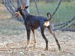 Die langen Schulterblätter sind gut bemuskelt, aber nicht voluminös. Die Schulterblattspitzen ragen leicht hervor. Die langen, schlanken Läufe haben leichte, aber kraftvolle ovale Knochen. Die Pfoten sind länglich (eher Hasen- als Katzenpfoten) mit langen, kräftigen und mobilen Zehen und widerstandsfähigen Ballen. |
