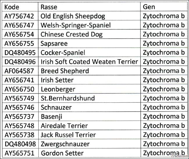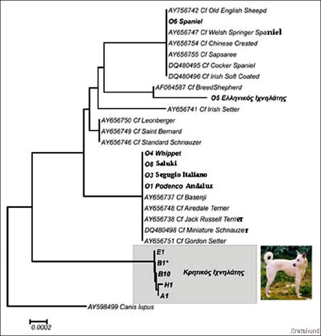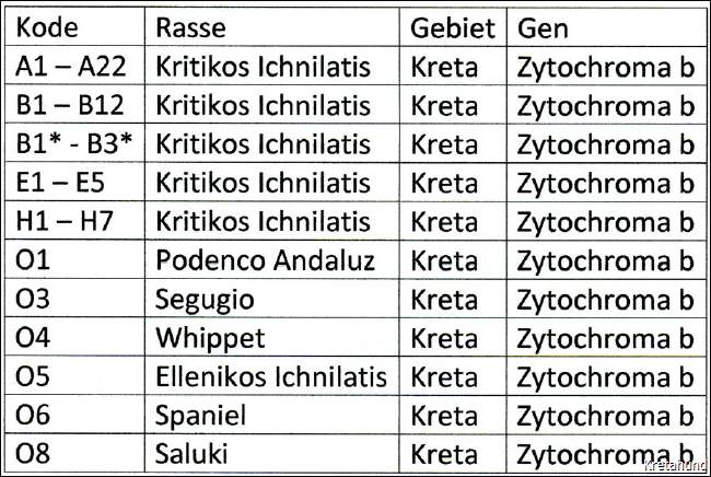 Im Rahmen des Forschungsprogrammes für die Reinzucht des Kritikos Ichnilatis (Canis familiaris) wurde die Analyse des gesamten Genoms (DNA) von insgesamt 49 Hunden aus dem Gebiet Kretas verwirklicht, welche morphologisch als Kritikoi Ichnilates bestimmt wurden und von 6 Hunden, welche auf Kreta leben, aber verschiedenen Rassen angehören (siehe Tabelle 1.). Von der Gesamtheit des genetischen Materials wurde auf die mitochondriale DNA (Zytochroma b) abgezielt, die zur Genüge in genetischen Analysen anderer Hunderassen der Welt benutzt wird. Insgesamt wurden ca. 500 DNA-Grundlagen der Zytochroma b gelesen. Nachdem sie auf geeignete Weise abgeglichen wurden, so daß sie verglichen werden konnten mit der entsprechenden DNA anderer Hunde, die wir von der genetischen Datenbank gesammelt haben (NCBI-Gen Bank, siehe Tafel 2.), wurden sie unter Benutzung der geeigneten statistischen Programme analysiert (MEGA, PAUP). Das Ergebnis war ein phylogenetischer Baum „Stammbaum“ (Abbildung 1.), auf welchem klar zu erkennen ist (wenn auch die genetische Differenzierung sehr klein ist), daß sich der Kritikos Ichnilatis von den übrigen Hunden unterscheidet (verschiedene Rassen). In der Tat, um sicher zu sein, daß die Differenzierung, die wir beim Kritikos Ichnilatis (Zweig Cretan Hound des Kritikos Ichnilatis) sehen, ausschließlich auf die Rasse dieses Tieres zurückzuführen ist und nicht auf die Isolation der Insel Kreta, haben wir in die Analyse auch andere Hunde (verschiedener Rassen) einbezogen, die auf Kreta leben (siehe Tafel 1), welche jedoch den Gruppen der anderen Hunderassen angehören, wie sie aus der genetischen Datenbank herausgesucht wurden (so hat die insellagenbedingte Isolation den antiken Typ nicht verändert , d.h. ihn also bewahrt) . All dieses spricht dafür, den Kretischen Hund so zu betrachten, daß er sich genetisch von den übrigen Hunderassen unterscheidet.