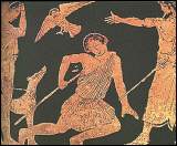 Artemis war die jungfräuliche Jägerin. Wer auch nur den Versuch machte, sie zu erobern, bekam ihre Rache zu spüren. So wurde der kretische Jäger Siproites in eine Frau verwandelt, nachdem er Artemis beim Baden beobachtet hatte. Für das gleiche Vergehen wurde Aktaion, der vom Kentauren Chiron zum Jäger erzogen worden war, von der Göttin in einen Hirsch verwandelt. Sie hetzte seine eigenen fünfzig Jagdhunde auf ihn, die ihn in Stücke rissen. Der Dichter Ovid nennt uns in seinem Gedicht über Aktaion Namen und Herkunft der Hunde: Der weise Ichnobates (Spürhund), ein Kretischer Jagdhund; Melampus (Schwarzfuß), aus Spartischer Zucht; Dorceus, Pamphagus und Oribasos aus Arkadien; Nebrophonos, Theron, Lailaps und Pterelas sind unübertroffen in ihrer Schnelligkeit; Agre (Jäger) zum Aufspüren; Hylaeus (Waldmann), kürzlich von einem Bären verwundet; Nape, eine schlanke Hündin, deren Vater ein Wolf war; Poemenis; Harpyia Sicyonius; Ladon; Dromas; Canache; Tigris; Sticte; Alce; Asbolos; Leucon; Lycisce; Cyprius; Lacon; Aello; Thoos; Melaneus; Harpalos; Labros und Argiodus hatten einen Kretischen Vater und eine Spartische Mutter; Hylactor; Melanchaetes; Theridamas; Oresitrophus und einige mehr. |